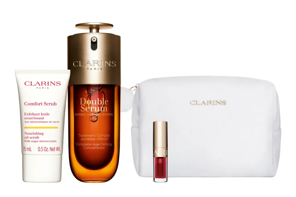 今年誕生40周年を迎えた、クラランスを代表する人気の美容液である『ダブル セーラム ADC』の現品に、唇の角質ケアとしても使用できる『コンフォート オイル スクラブ』、うるおいとツヤを与える『リップコンフォートオイル 03』のミニサイズをセット。リップからスキンケアまで網羅した特別なキットになっています。