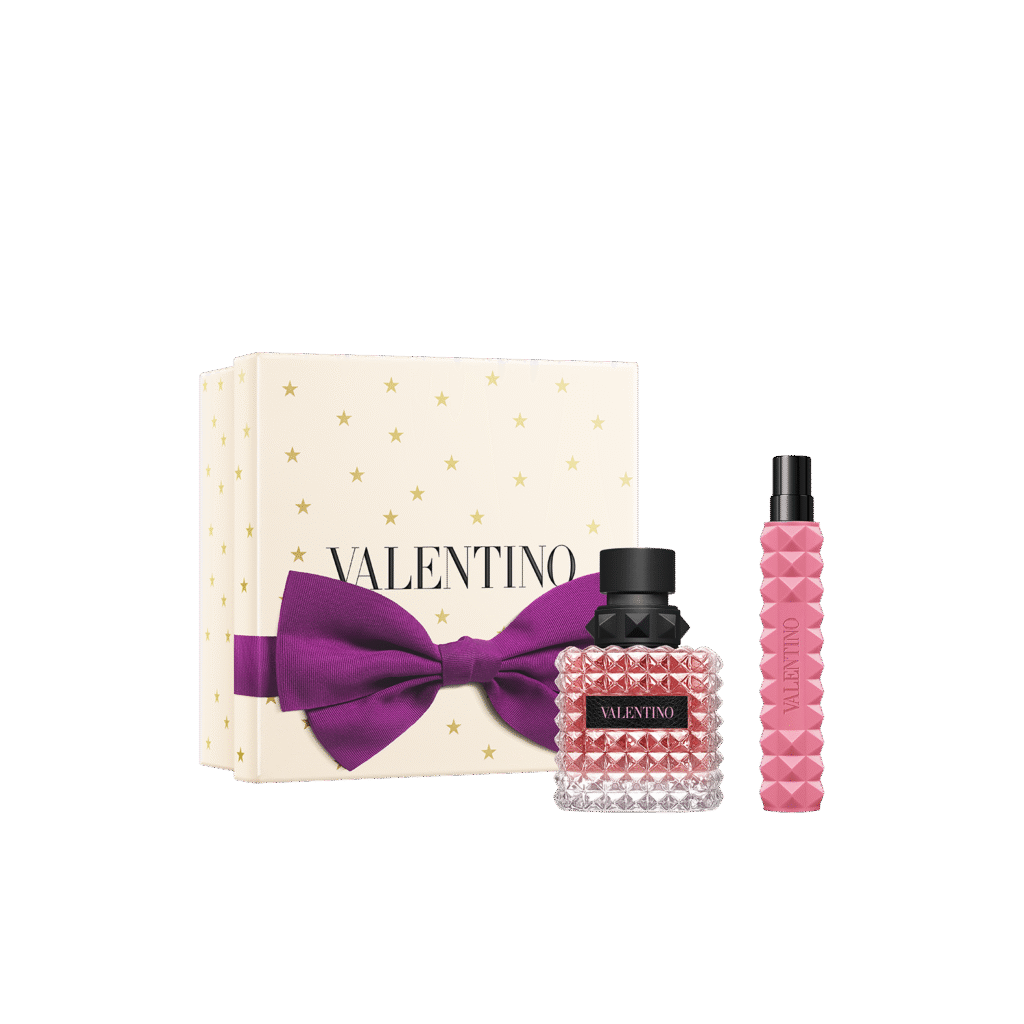 全面にスタッズがあしらわれたピンクのボトルの『ヴァレンティノ ドンナ ボーン イン ローマ オードパルファン』の、50mlと持ち運びに便利な10mlボトルがセットになっており、見た目にも華やかで嬉しいギフトボックスは、自分自身や大切な人へピッタリ。香りは、ジャスミンやバニラなどのフローラルウッディの香りとなっています。