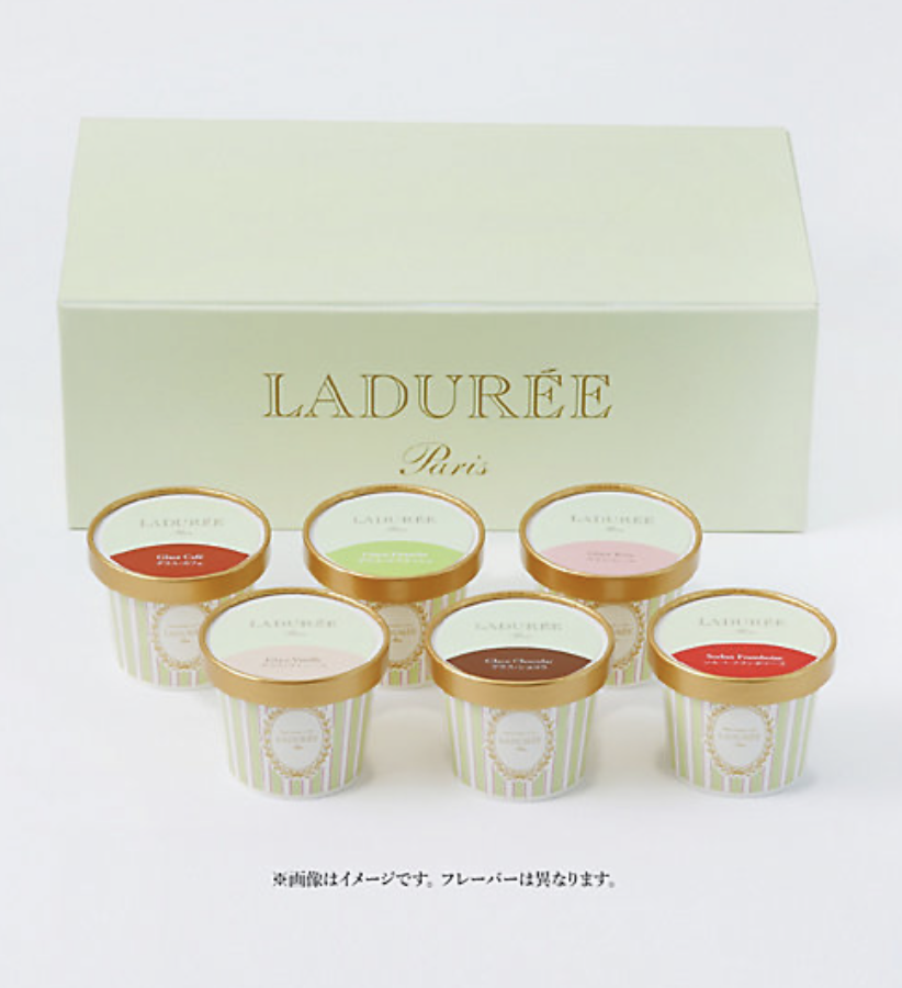 人気のマカロンフレーバーをオマージュした6種類のアイスをラデュレらしい上品なパッケージに詰め合わせた、見た目にも美しいギフトセット。