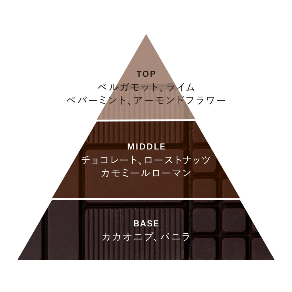 香りもしっかり、ガチなチョコ。ベースにはカカオニブがあり、チョコレートやナッツ、そしてアーモンドフラワーも。大人の色気と甘い誘惑を兼ね備えた、おしゃれなアイテムです。