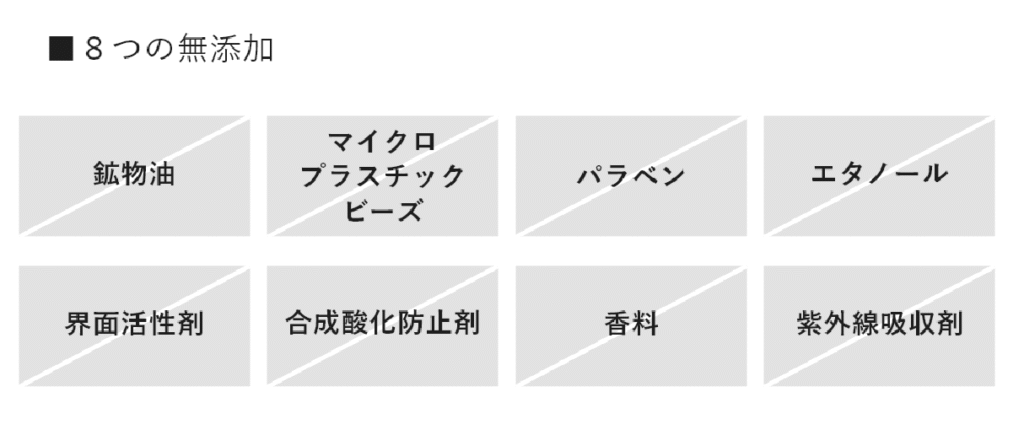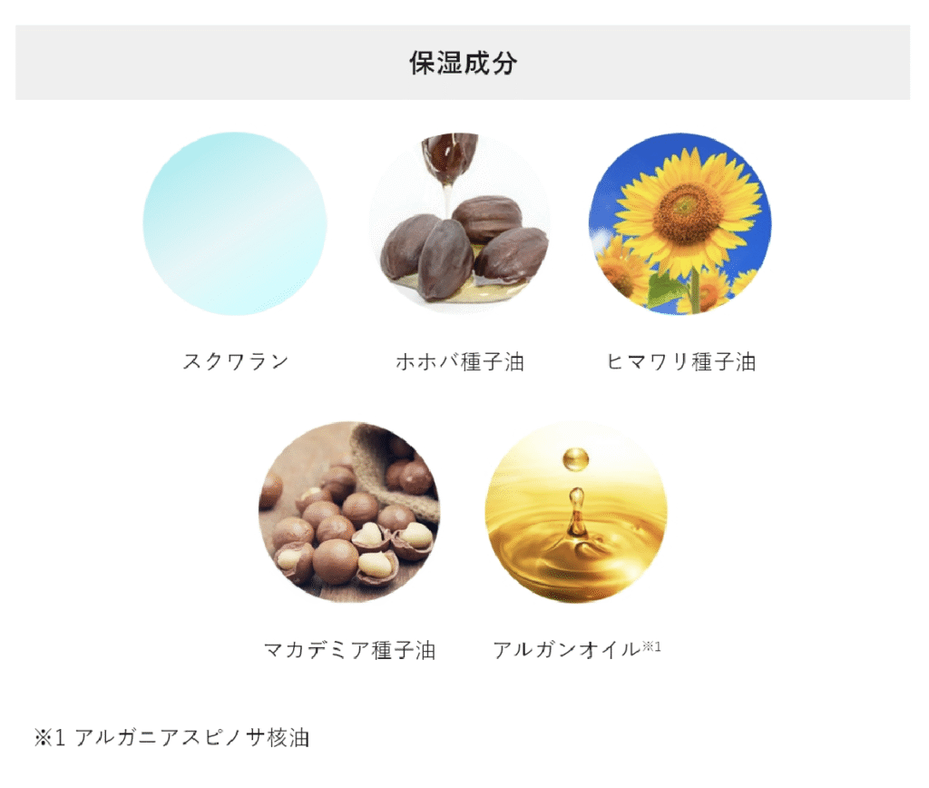 ※ スクワラン、アルガニアスピノサ核油、マカデミア種子油、ブドウ種子油、オリーブ果実油(すべて保湿成分)