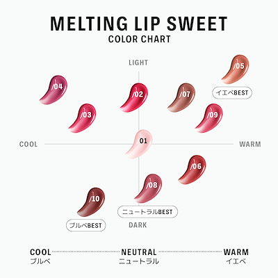メルティングリップスウィートは、ひと塗りで鮮明なツヤと立体感を叶えるボリュームリップ。計算された10色のカラーバリエーションが、肌トーンを美しく引き立てます。スキンケア成分を配合したメルティング処方で、唇に触れた瞬間とろけるようになじみ、ぷるんと潤う仕上がりに。メイクアップ効果とケアを同時に楽しめる、毎日使いたくなる一本です。
