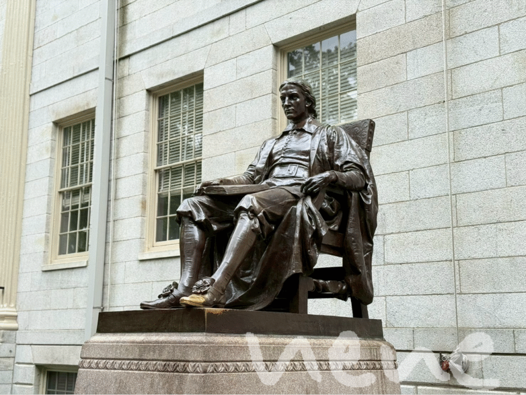また、学内の観光名所として人気の一つなのが「ジョン・ハーバード像」です。大学の中心部、ハーバード・ヤード内にあり、いつも観光客が記念撮影を行うために列をなしています。