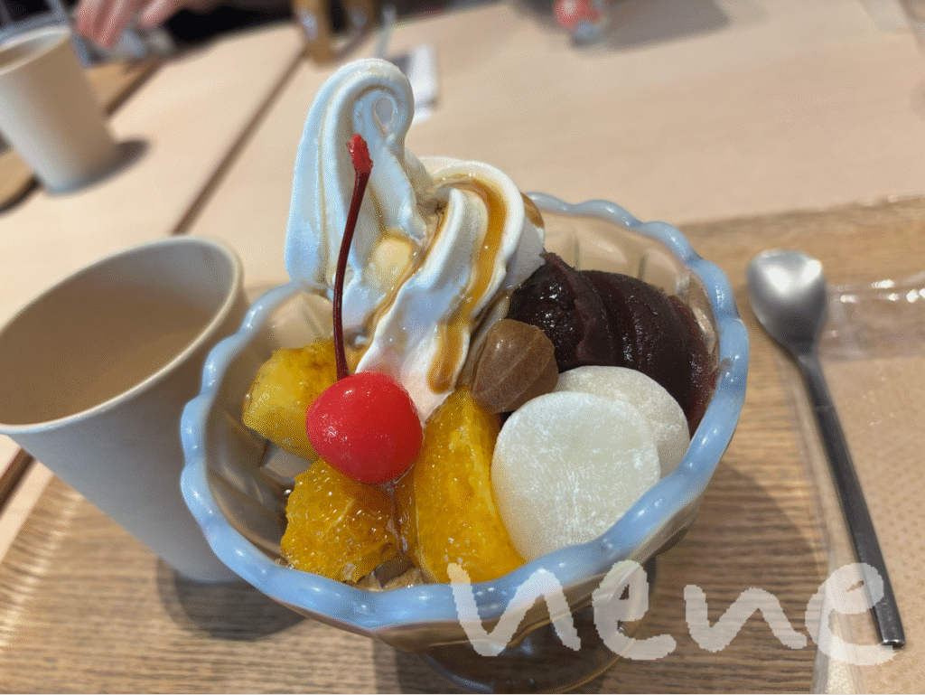 店内では、一番人気というあんみつパフェをいただきました。あんこもしっとり、甘すぎず上品な味わい。ソフトクリームも濃厚で相性抜群。あんみつは四種類の中から好きな味を選ぶことができ(梅ぼ志あめ、黒あめ、あまおうあめ、蜂蜜れもんあめ)、寒天やおもち、フルーツとの組み合わせも最高でした。
