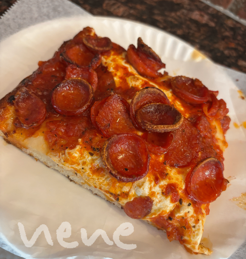 みんな大好きペパロニがたっぷり乗ったスクエア型ピザです。少しスパイシーなペパロニと、その下にあるたっぷりチーズにもちもちの分厚い生地が相性抜群。少しオイリーなので炭酸と一緒にかきこんじゃうのが最高。これはマストで注文してみて欲しい。