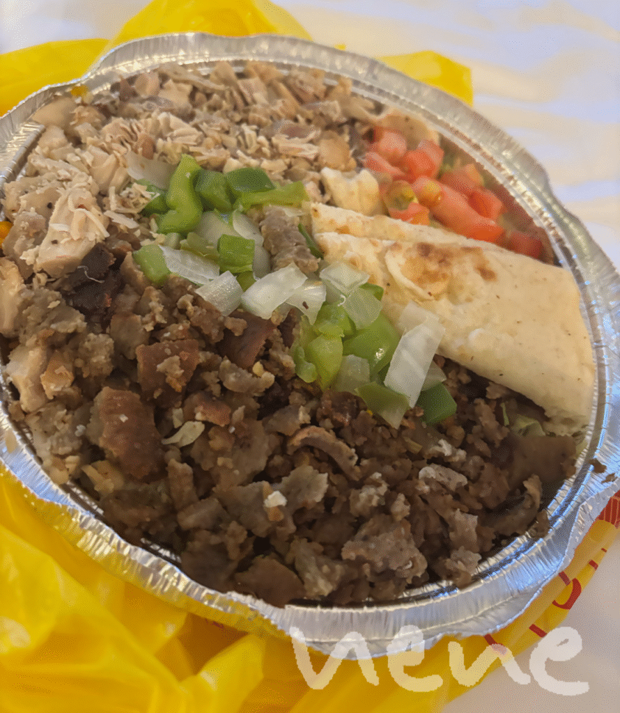 こちらがチキンとビーフのコンボです。他にはトマト、ピーマン、下にレタスがぎっしり敷き詰められており、さらにその下にはメキシカンライスがたっぷり入っています。これでお値段なんと12ドル!安い!