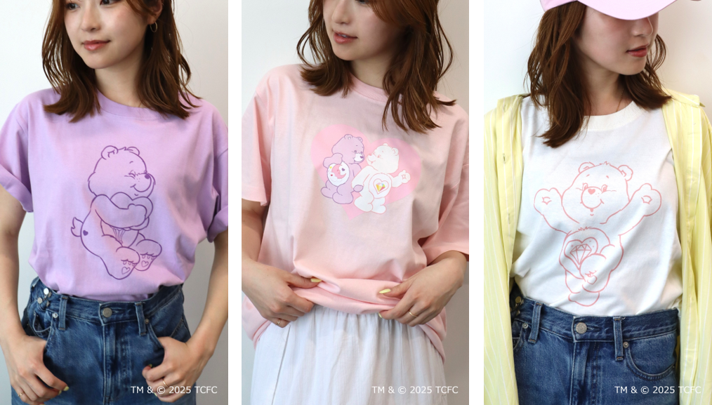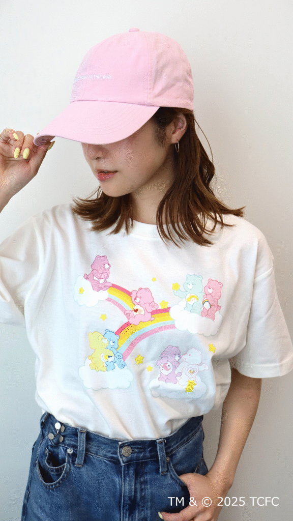Tシャツのテーマは、「大人かわいいケアベア」。大きめに着用できるサイズ展開で、ゆるっとトップスにしたり、デニムインしたりとアレンジもでき、体型も気にせず楽しめるのが魅力です。