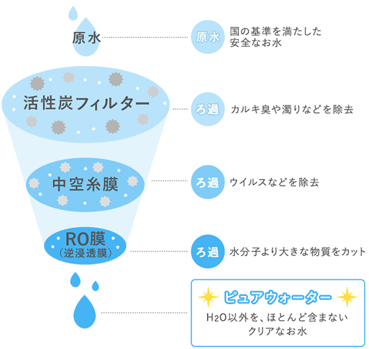 特殊フィルターで1,000万分の1mmの不純物まで取り除いたピュアなRO水を採用。