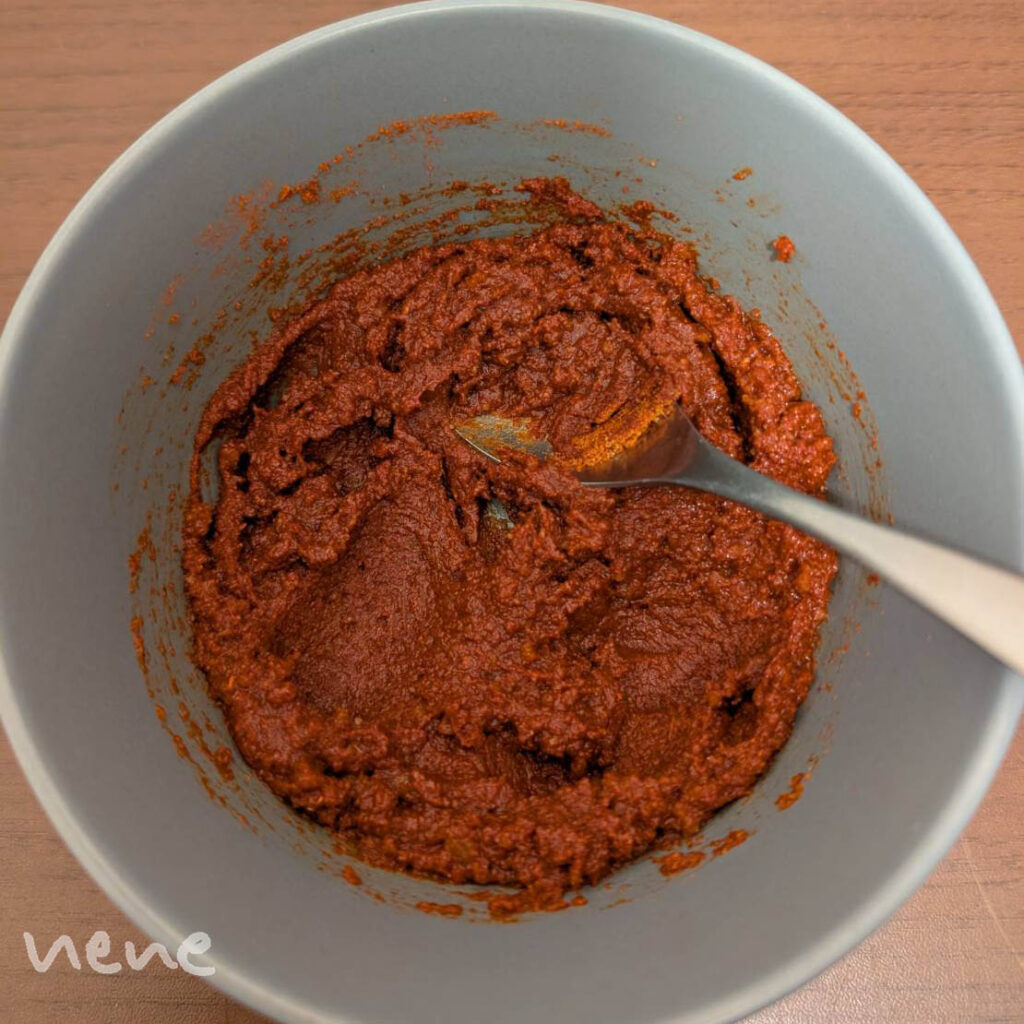 ちなみに、唐辛子粉は辛味をしっかり感じられる細かな粉末にしています。それでもあまり辛味を感じられない時は、隠し味にサドンデスソースをたらり。