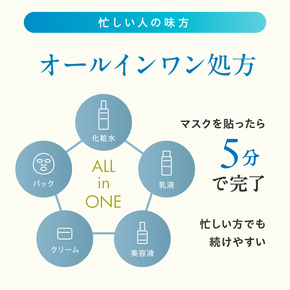 お手入れはたったの5分で完了。乳液やクリームでフタをする必要もないオールインワンタイプのシートマスクなので、忙しい時に大活躍してくれること間違いなしです。