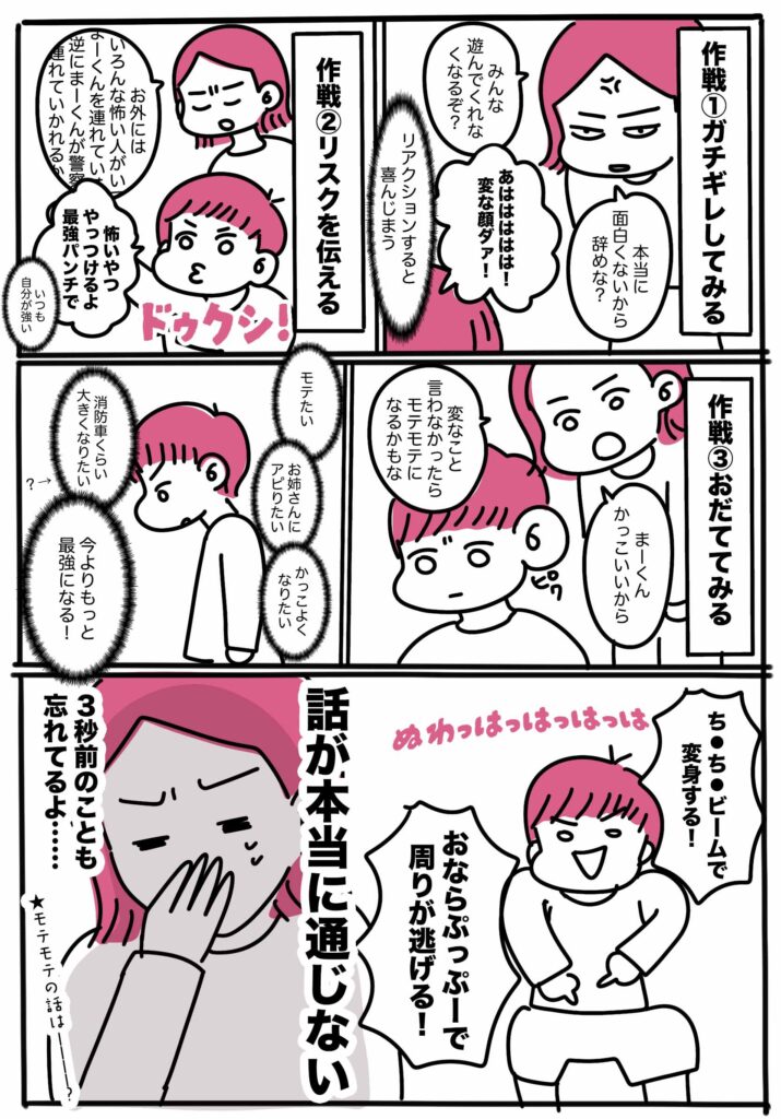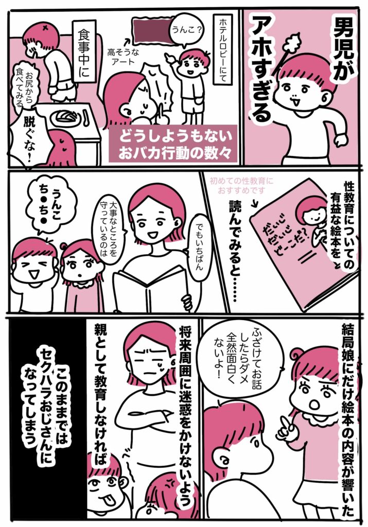 【エッセイ漫画】男の子と女の子⑱男児がアホすぎる件COLUMNTwitterFacebook2025.04.24うちの子だけかと思いきや、割と男児あるあるらしく、皆さんがどう対応しているか本気で教えて欲しい。下ネタが面白くて仕方がない年齢ってありますよね。私が結構そのタイプだったので分かるんですが、もう少しTPOを考えて周囲に嫌な思いをさせないように気をつけたい……しかし話してみても3秒後に全然違うこと考えているのでマジで困る。次回もお楽しみに!前回のお話はこちら【エッセイ漫画】男の子と女の子⑰まーくん幼稚園に入るゆるゆる育児&日常エッセイ漫画「男の子と女の子」。日常ネタ多め。