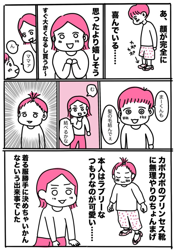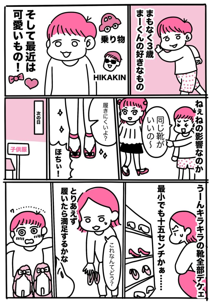 【エッセイ漫画】男の子と女の子㉑プリンセスになりたい男児COLUMNTwitterFacebook2025.07.04もうすぐ3歳になる、まーくんの好きなもの。お姉ちゃんの影響で憧れたのか、なぜかはわかりませんが好きなものを身につけて欲しい。しかし不安定な靴が故に15センチからしかサイズがないのが悔しい!ヒールのないミニサイズのキラキラ靴を探さなければ。次回もお楽しみに!前回のお話はこちら【エッセイ漫画】男の子と女の子⑳それぞれの美学ゆるゆる育児&日常エッセイ漫画「男の子と女の子」。日常ネタ多め。