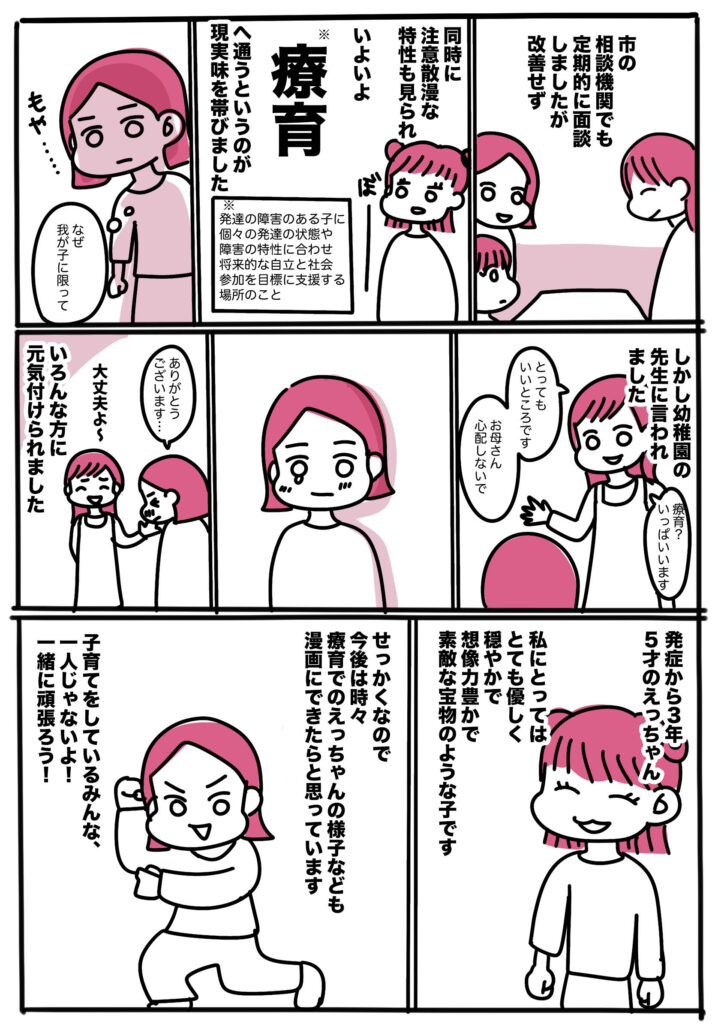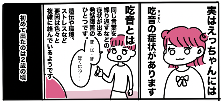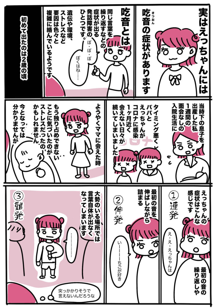 【エッセイ漫画】男の子と女の子㉕娘は吃音ですCOLUMNTwitterFacebook2025.09.17実は、5歳になる娘には吃音の症状があります。吃音は多くが徐々に症状が消滅するそうなのですが、発症から3年経ってもまだ、その気配はなさそうです。でも、えっちゃんは毎日楽しく元気に過ごせてます。色んな支援の形があると思うので、母としても勉強して、えっちゃんをサポートしたいと思っています。次回もお楽しみに!前回のお話はこちら【エッセイ漫画】男の子と女の子㉔息子、ワニになるゆるゆる育児&日常エッセイ漫画「男の子と女の子」。日常ネタ多め。