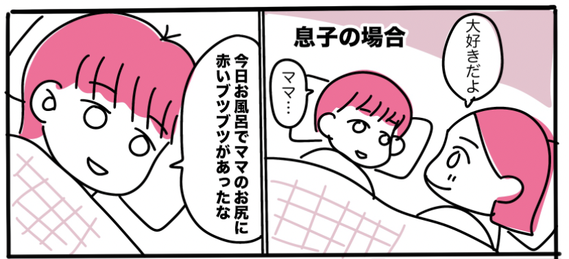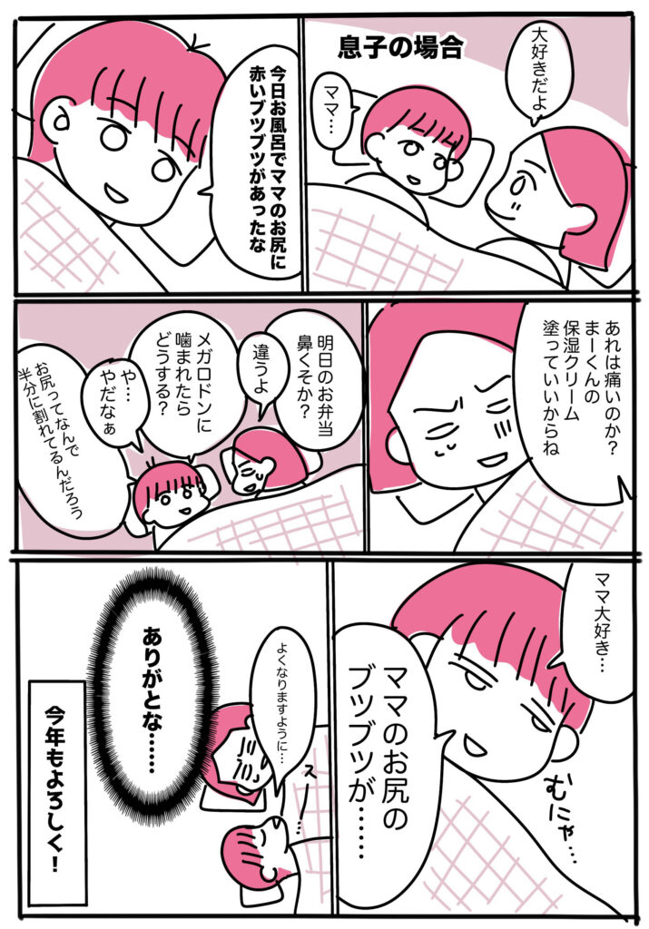【エッセイ漫画】男の子と女の子㉝寝る前のコミュニケーションCOLUMNTwitterFacebook2026.01.03就寝前の子供達とのコミュニケーション。息子は息子で喋りたいことだらけみたいで、聞いていて面白いですが、私のお尻のぶつぶつのことは幼稚園で言わないでほしいな……と思うこの頃です。次回もお楽しみに!前回のお話はこちら【エッセイ漫画】男の子と女の子㉜発達グレーの子育てゆるゆる育児&日常エッセイ漫画「男の子と女の子」。日常ネタ多め。