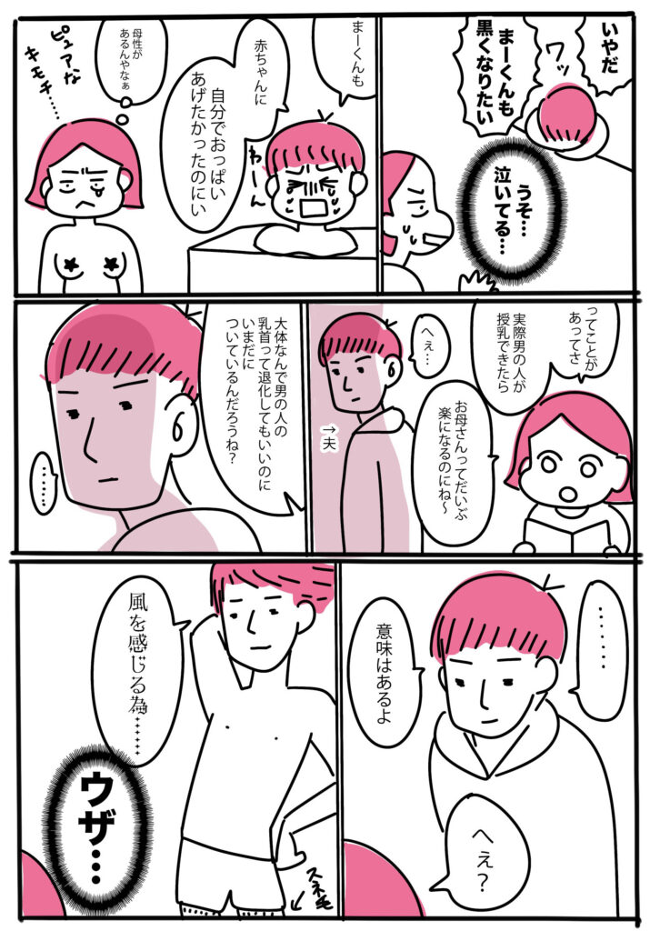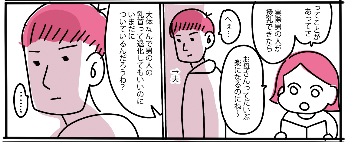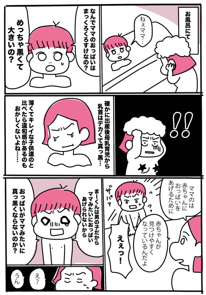 【エッセイ漫画】男の子と女の子㉟男の乳首はなぜ存在するのかCOLUMNTwitterFacebook2026.01.17お風呂にて、息子に言われたショックな一言。うちの夫はボケてなくて、本気でこういう回答をしています。いや怖いって。にしても、父親も授乳できたら本当に楽なのにねぇ。次回もお楽しみに!前回のお話はこちら【エッセイ漫画】男の子と女の子㉞オナラを肯定するということゆるゆる育児&日常エッセイ漫画「男の子と女の子」。日常ネタ多め。
