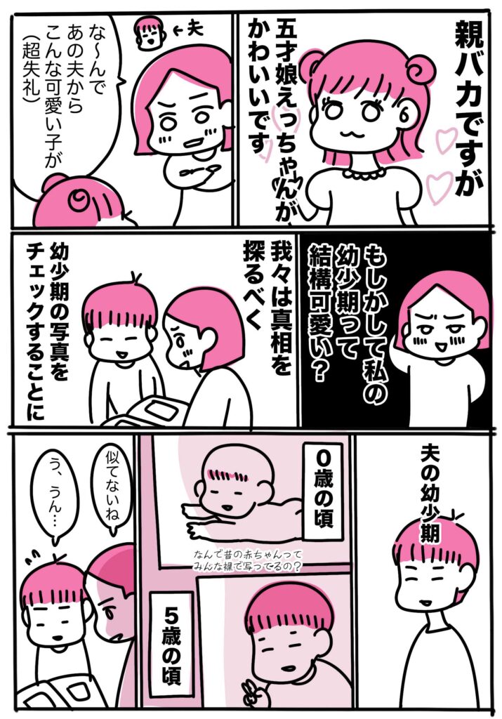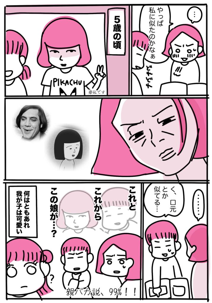 【エッセイ漫画】男の子と女の子㊺娘は誰に似た?COLUMNTwitterFacebook2026.04.062026.03.22我が娘が、お目目キュルンで可愛いなぁと親バカしていたのですが。親バカフィルターだとしても、全親がそうなように、我が子は超絶可愛いぞ!次回もお楽しみに!前回のお話はこちら【エッセイ漫画】男の子と女の子㊹変な夢・後編ゆるゆる育児&日常エッセイ漫画「男の子と女の子」。日常ネタ多め。画像はアントン・シガー(ノーカントリー)、野口さん(ちびまる子アニメ)お借りしました。