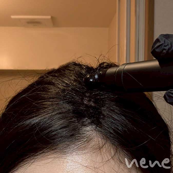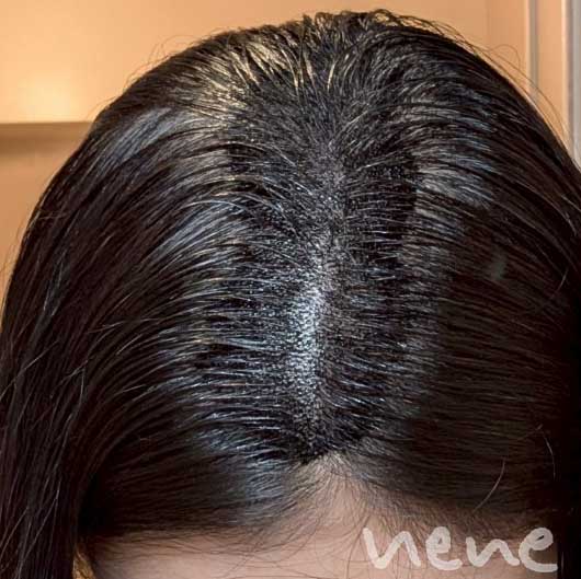 説明書通り、塗布した状態で5分放置。さて、シャンプーして乾かしたら、私のつむじはどうなるのでしょうか?