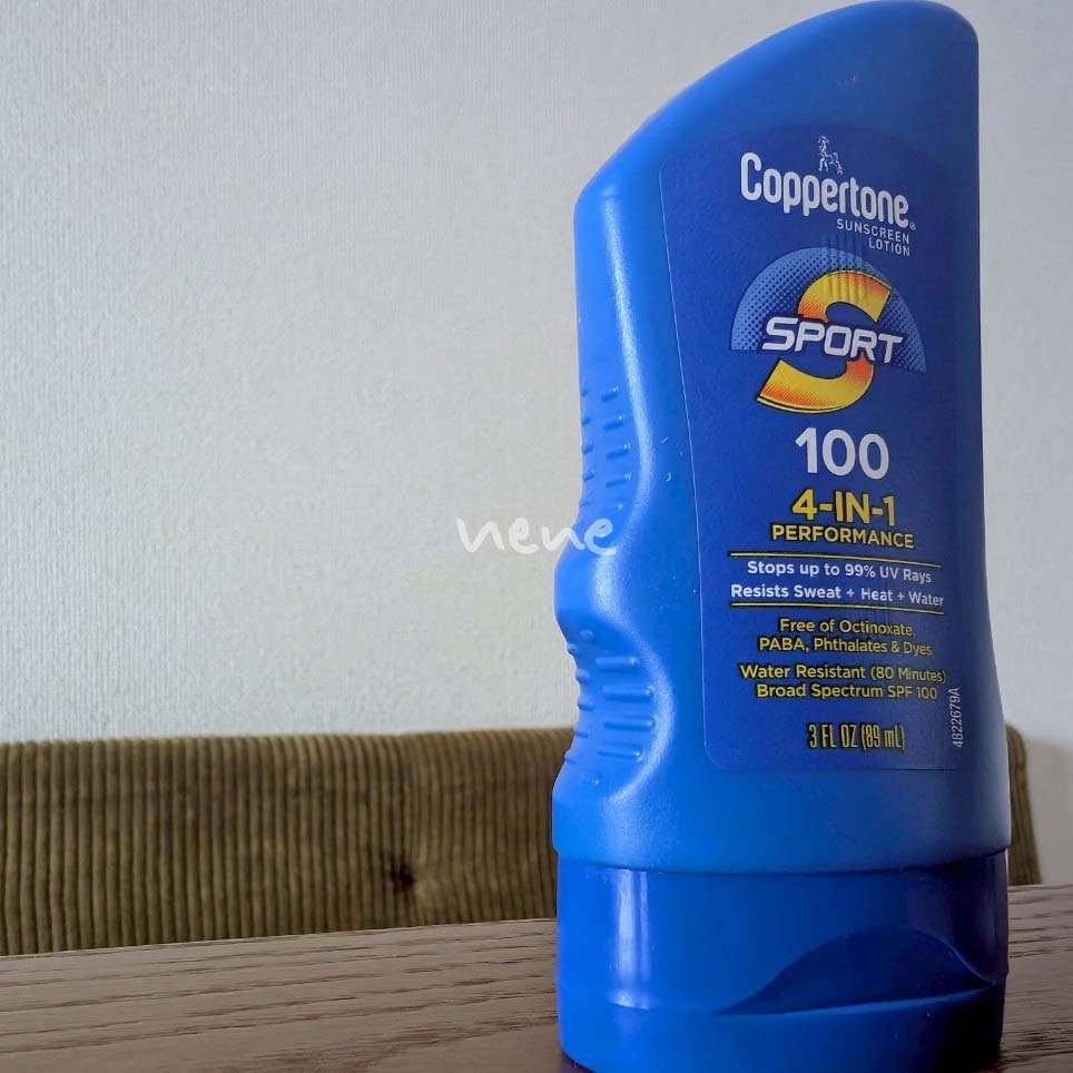 今回試してみるCoppertone, スポーツ、サンスクリーン ローション、4イン1パフォーマンス。正直SPF100って肌に塗って平気なのか怖いところもあります。