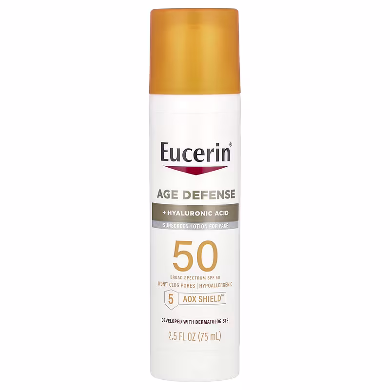 Eucerin, エイジディフェンス、軽いつけ心地の日焼け止めローション、顔用、SPF数値50、無香料、75ml(2.5液量オンス)
