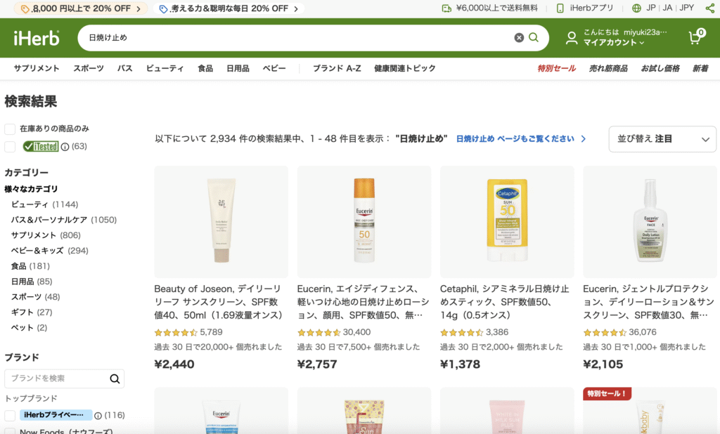 さて、iHerbで日焼け止めを検索すると、