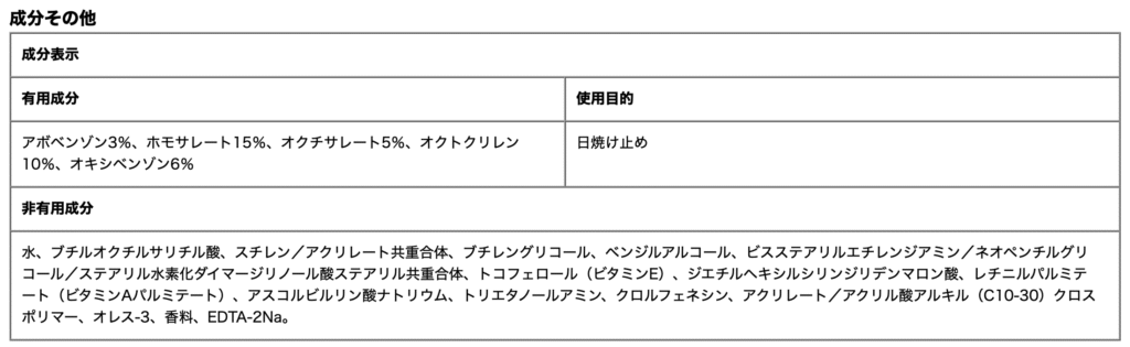 ホモサレート15%、オクトクリレン10%、オキシベンゾン6%など、UVB・UVA対応の成分をバランスよく配合。SPF100の根拠とも言える。