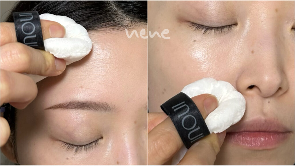 おでこの生え際や鼻横、口元などテカらせたくない部分に②を、パフで抑えていきます。