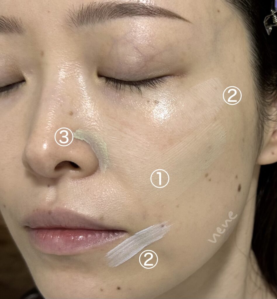 顔全体に別の下地を塗った後、頬の赤みには①を、明るくしたい口元や頬の高い位置は②を、そして小鼻の赤み隠しには③を使用します。