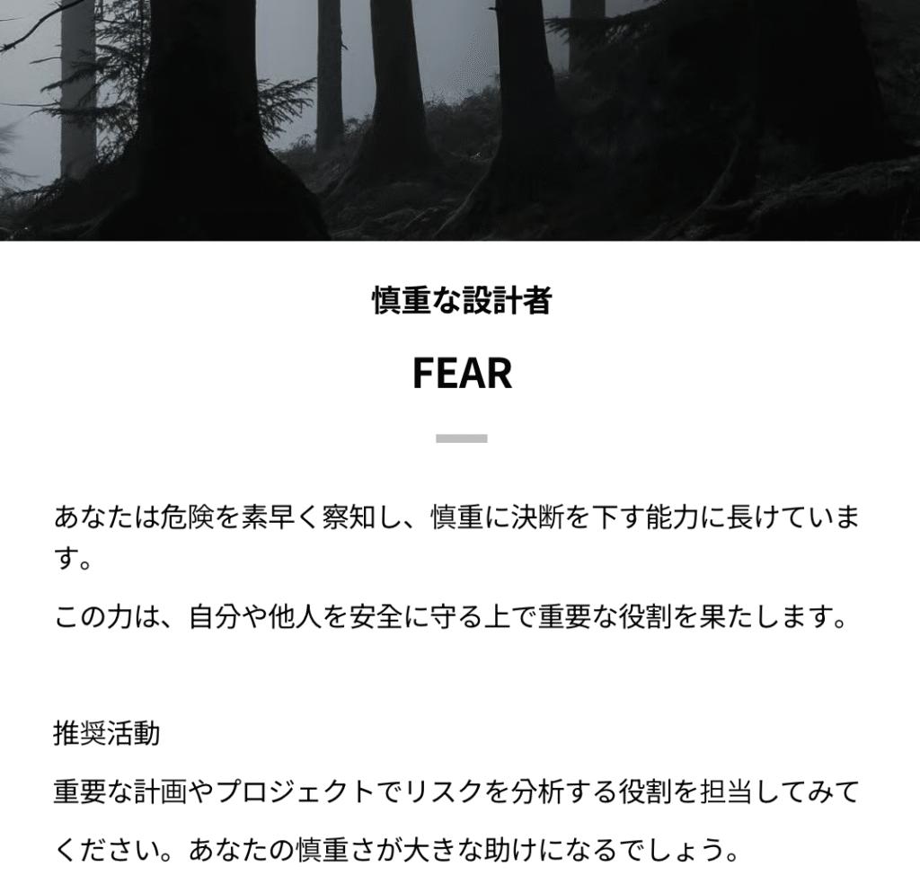私の結果は、FEAR(恐れ)でした