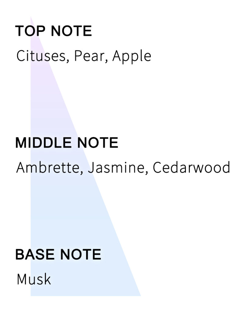 シトラス系列の香りがあるが、時間が経つと共にマスク香りが残香で残り、さっぱりしながら残香はふんわり残る。多様なマスク香りのハーモニーが純粋で綺麗なイメージであると共に官能的なポイントを持つ香り。