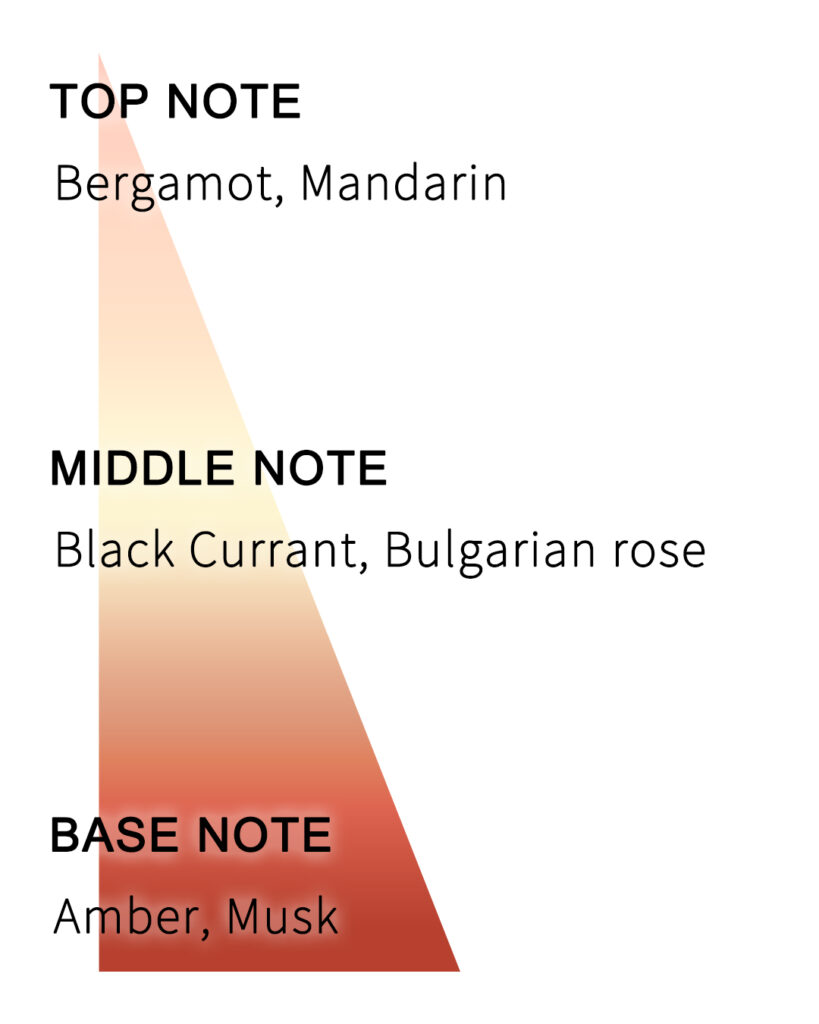 露を含むブルガリアンローズのラグジュアリーさと異国的な雰囲気のブラックカラントの完璧な調和。始めはブルガリアンローズにベルガモットが強烈に吹き出て雨の中のバラ花畑を連想させ、その後はブラックカラントの甘い果実香りとアンバー、マスクが存在感を表す。