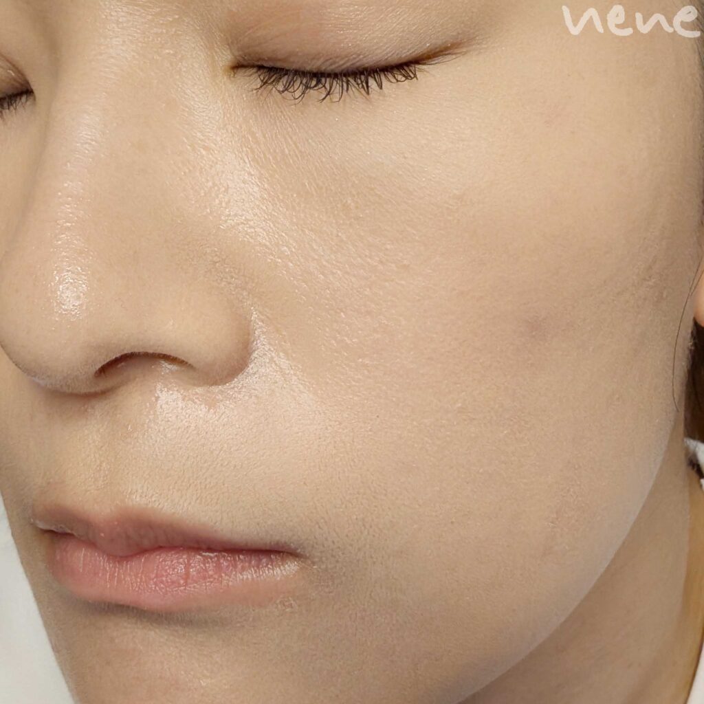 テクスチャはとてもみずみずしいのですが、定着が早いので、半プッシュの少量をさっと素早く塗り伸ばすと、すでに薄膜フィット。毛穴が整っている*3のが分かります!