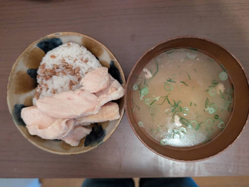 サラダチキン皮付き100g+冷凍したバーリーマックス入りご飯100g+野菜の多い味噌汁=約389kcal