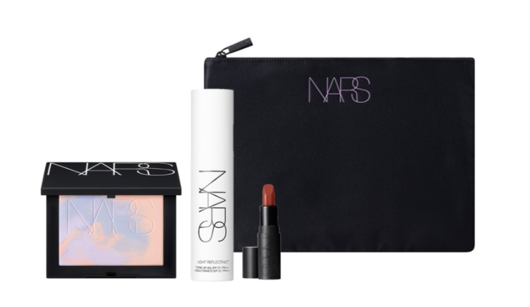 セットの内容は、マーブル”リフ粉”、同シリーズの人気下地『ライトリフレクティング トーンアップヴェール』、『NARS エクスプリシット リップスティック』が入ったもの。