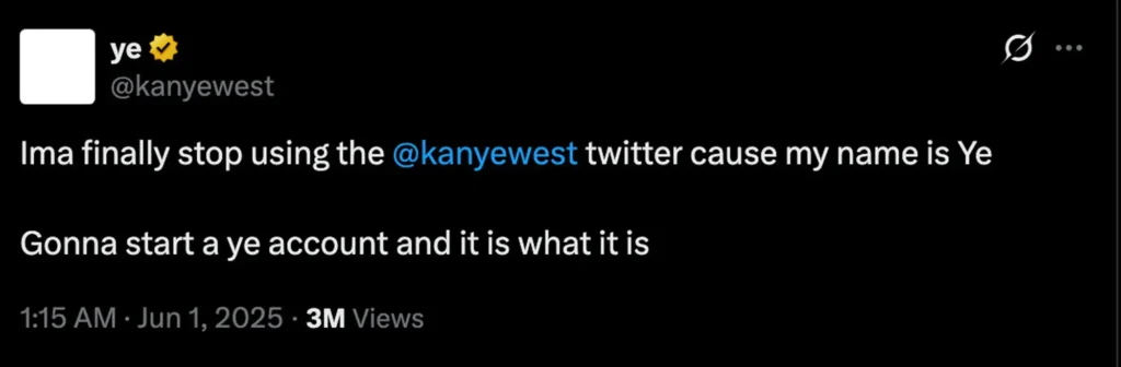 ちなみにカニエは6月頭にXにて「俺はkanyewestのアカウントじゃなくてYeのアカウントに作り直すから」と宣言しておりました。ということは今度のアカウント名はyeye?