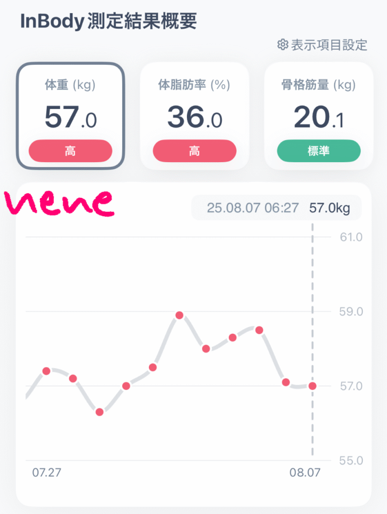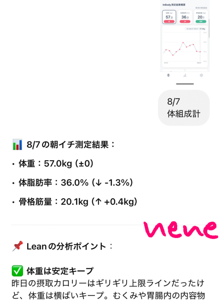 体組成計Inbody(インボディ)の測定結果をスクショして送ります。
