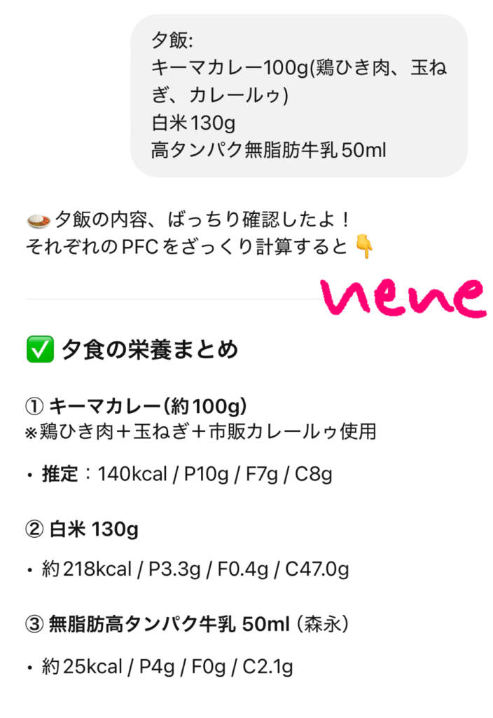 カロリー、PFCバランスとフィードバックを瞬時に出してくれます。