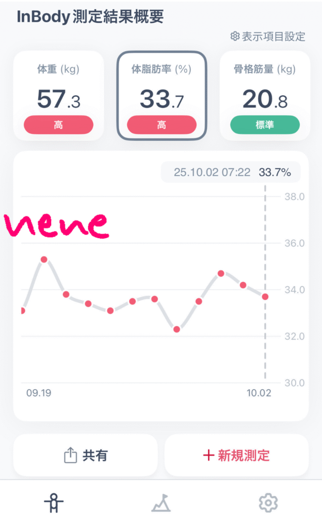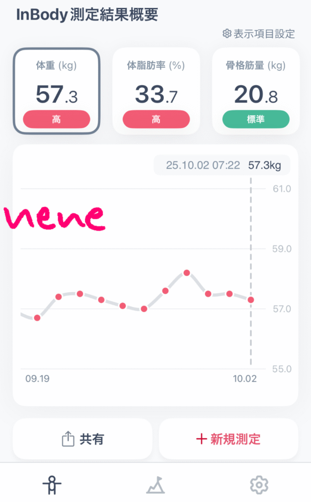 | 2025/10/2 | 57.3kg | 33.7% | 25.6 |