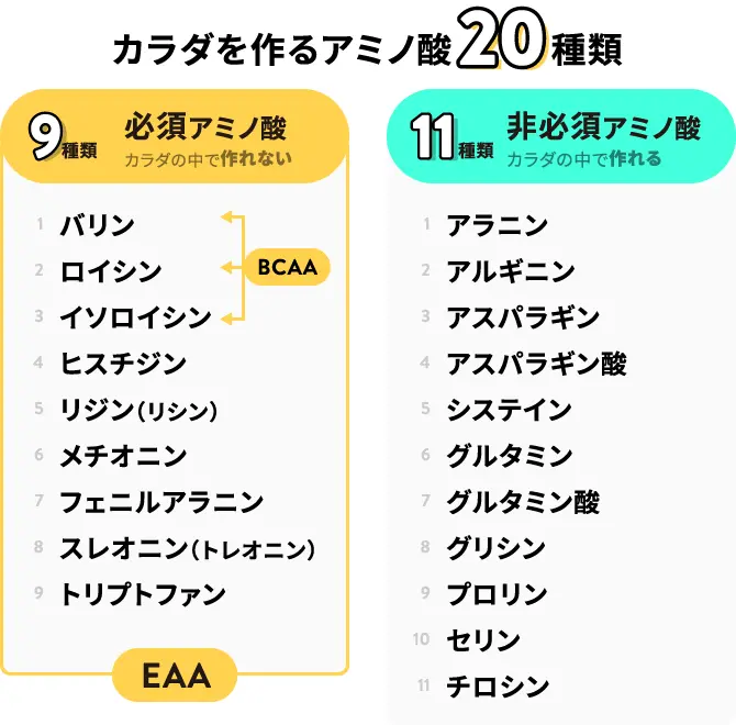 EAAは「Essential Amino Acid」の略。日本語にすると「必須アミノ酸」です。