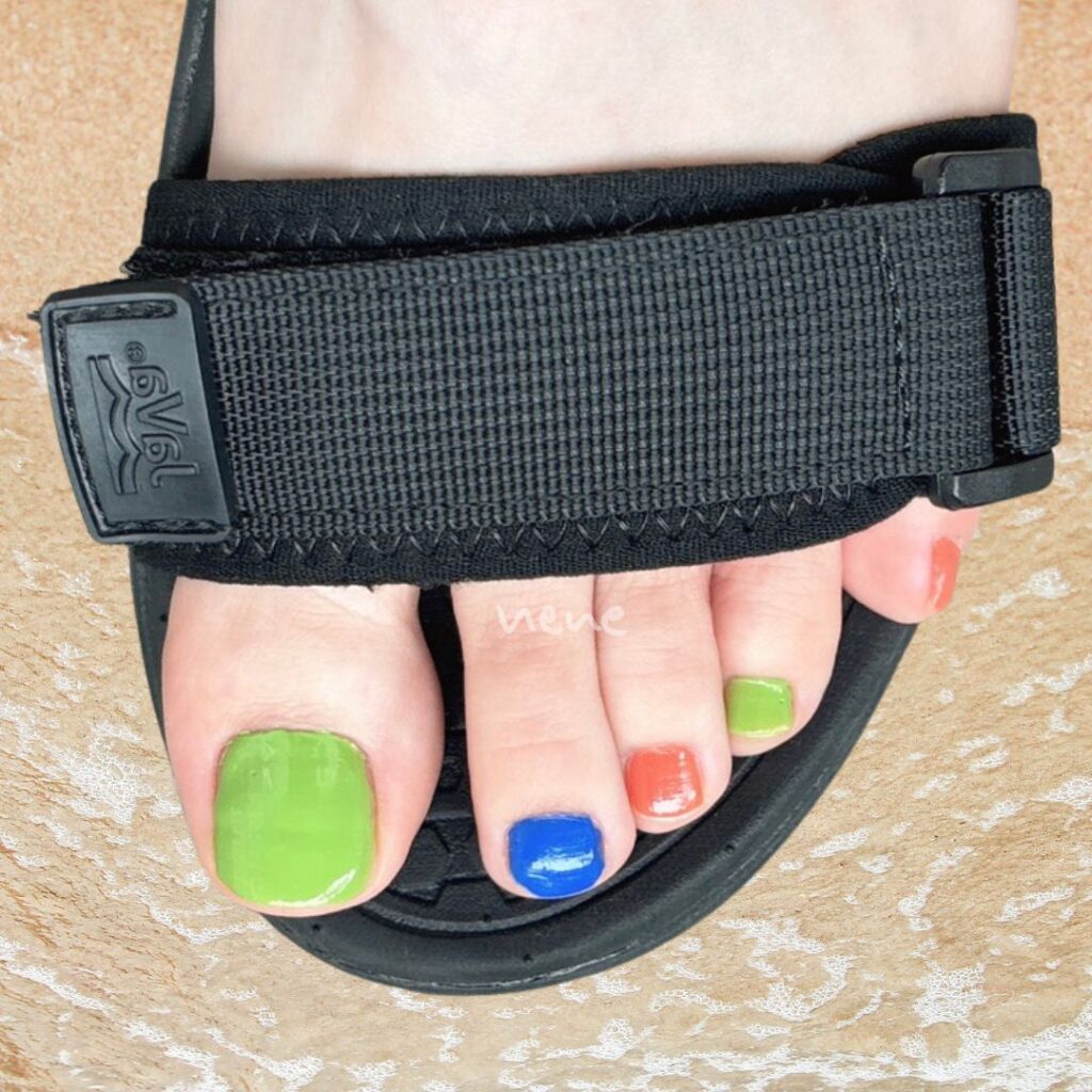 ビビッドネイルは黒や濃いめカラーのサンダルと合わせることで、強めカラーがより引き締まって見えるよ。