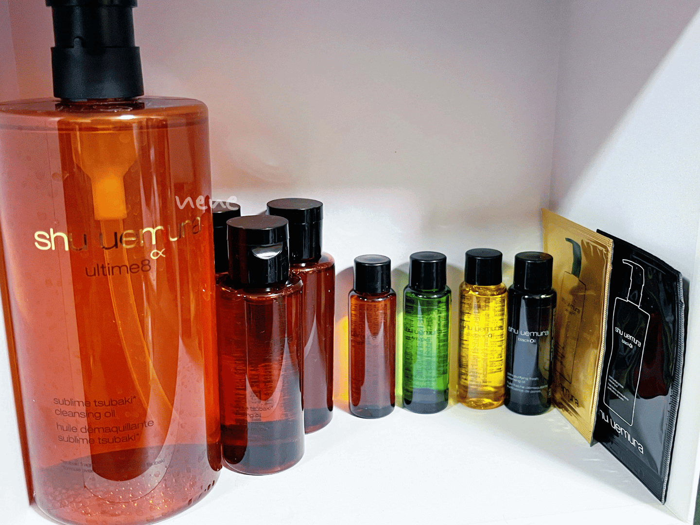 つまり、画像にあるミニサイズなボトルはすべて「無料プレゼント」です。友人に話したら「大丈夫?シュウウエムラ倒産しない??」と言われました。その気持ち、よくわかる。