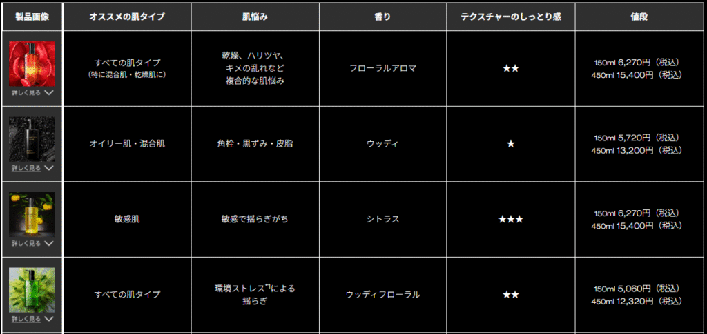 公式サイトでは各肌タイプや肌悩みに向けて比較表を公開していますが、クレンジング力の差があるのかは記載しているのが気になるところです。