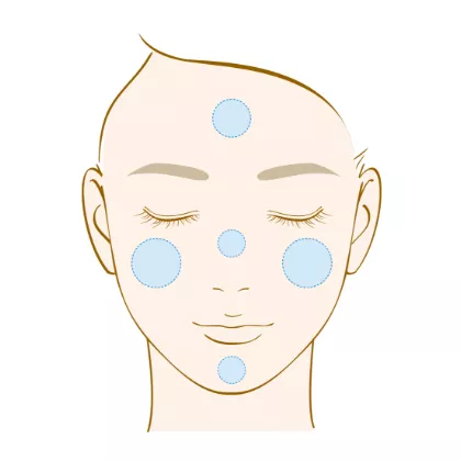 ①泡をつぶさないように、顔(両ほお、ひたい、あご、鼻)にのせます。