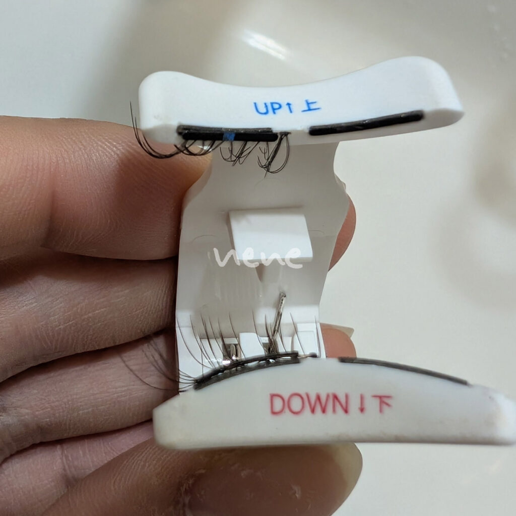 その重なったまつげを剥がして、専用の上下に分かれたアプリケーターにくっつけ、まつげに装着させるのです。